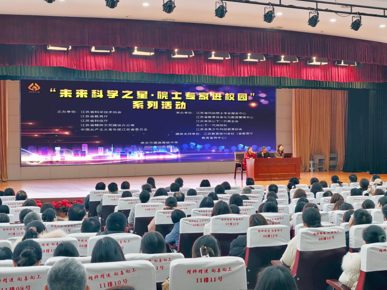 江苏省“未来科学之星•院士专家进校园”系列活动在南京航空航天大学附属高级中学 成功举办 2026-01-05 2025年12月31日,由江苏省科学技术协会、江苏省教育厅、江苏省科学技术厅、江苏省精神文明建设办公室、中国共产主义青年团江苏省委员会主办,江苏省科协院士专家服务中心、江苏省信息化与数据管理中心、江苏省关心下一代基金会、关心下一代周报社、江苏省青少年科技教育协会、江苏省青少年科技教育协会生涯规划专委会承办,江苏教育报刊总社(省教育厅教育宣传中心)为媒体支持单位的江苏省“未来科学之星•院士专家进校园”系列活动在南京航空航天大学附属高级中学成功举办,超过1400名师生齐聚一堂,共同参与这场科学盛宴。
